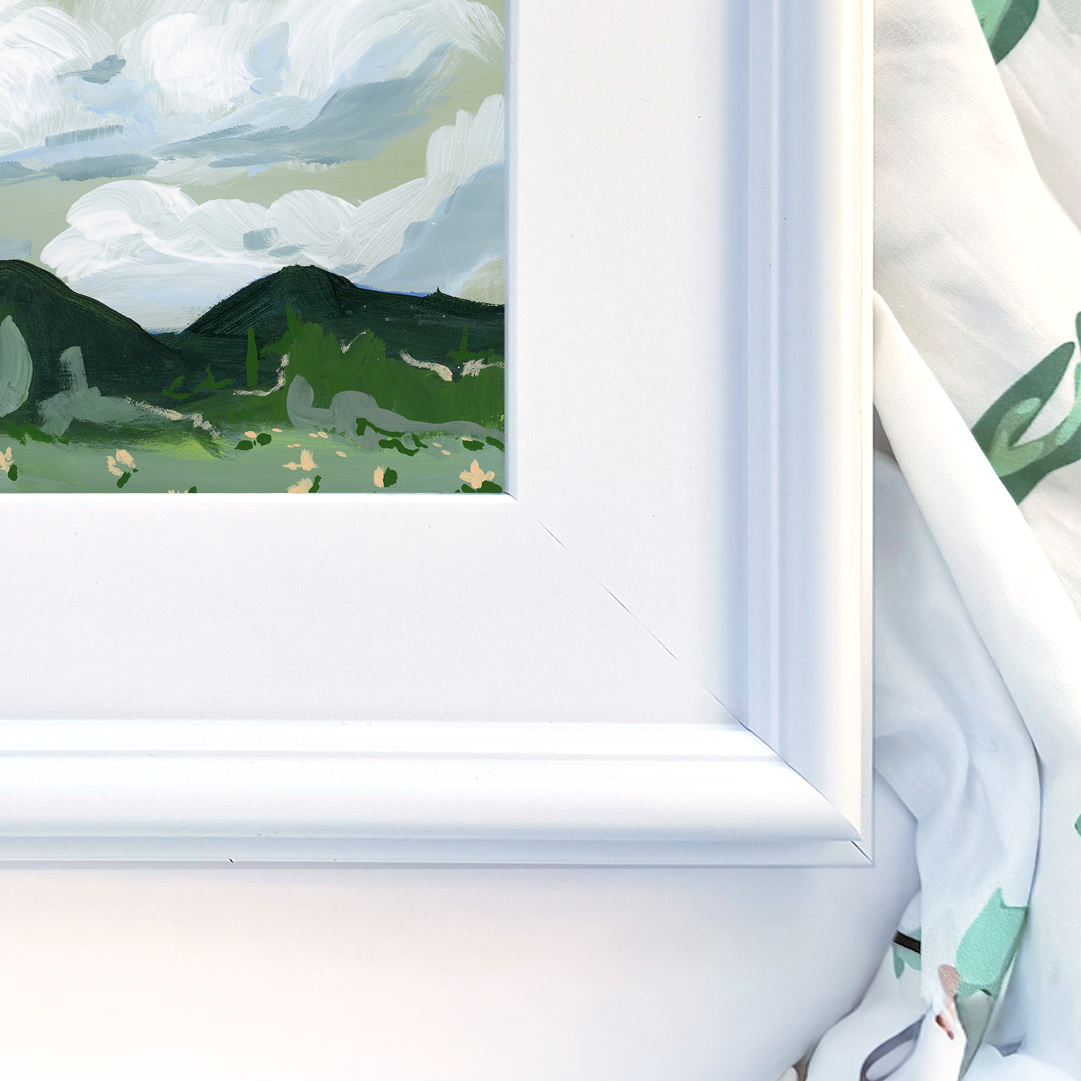 acrylic and gouache paint on gesso board, framed in a white, traditional style frame