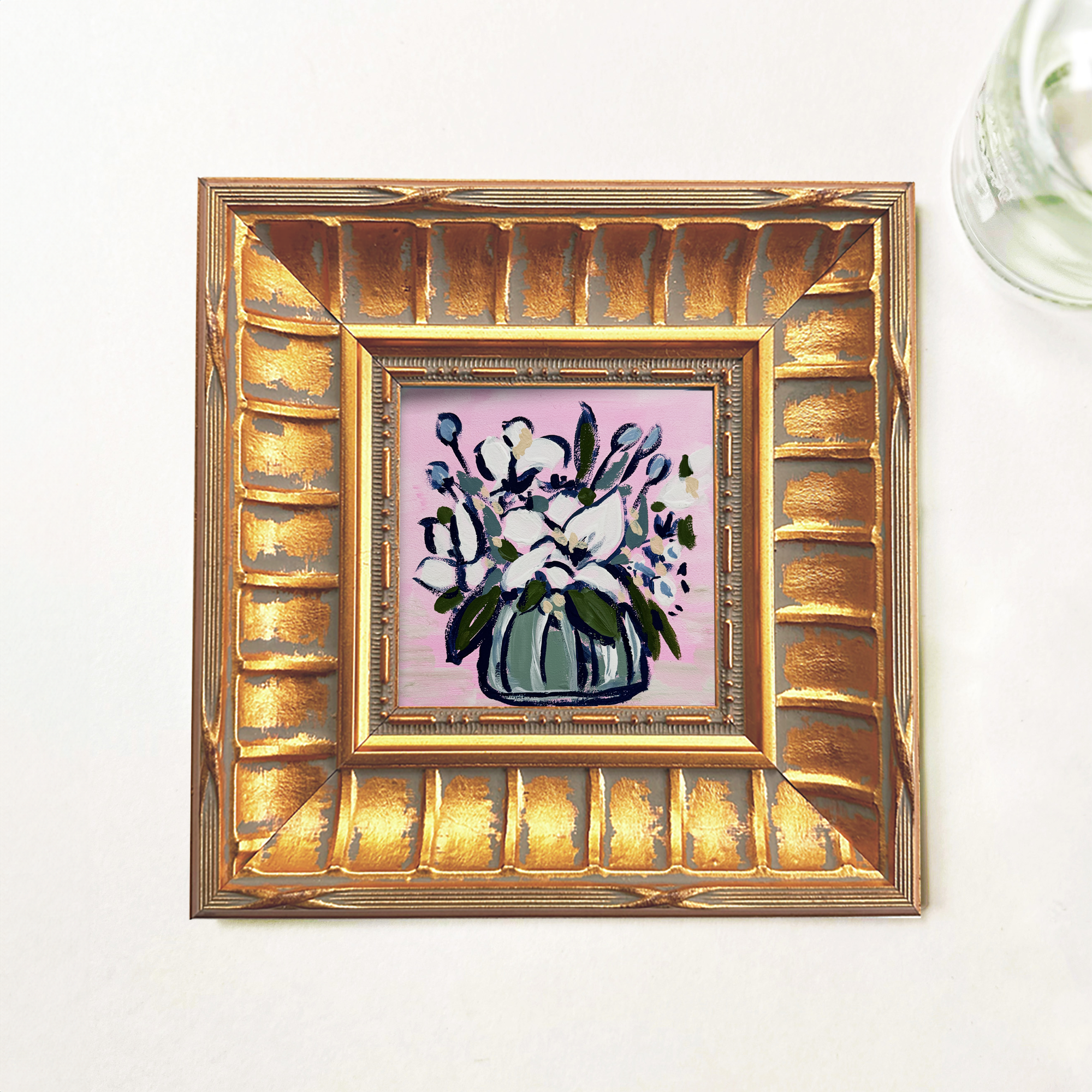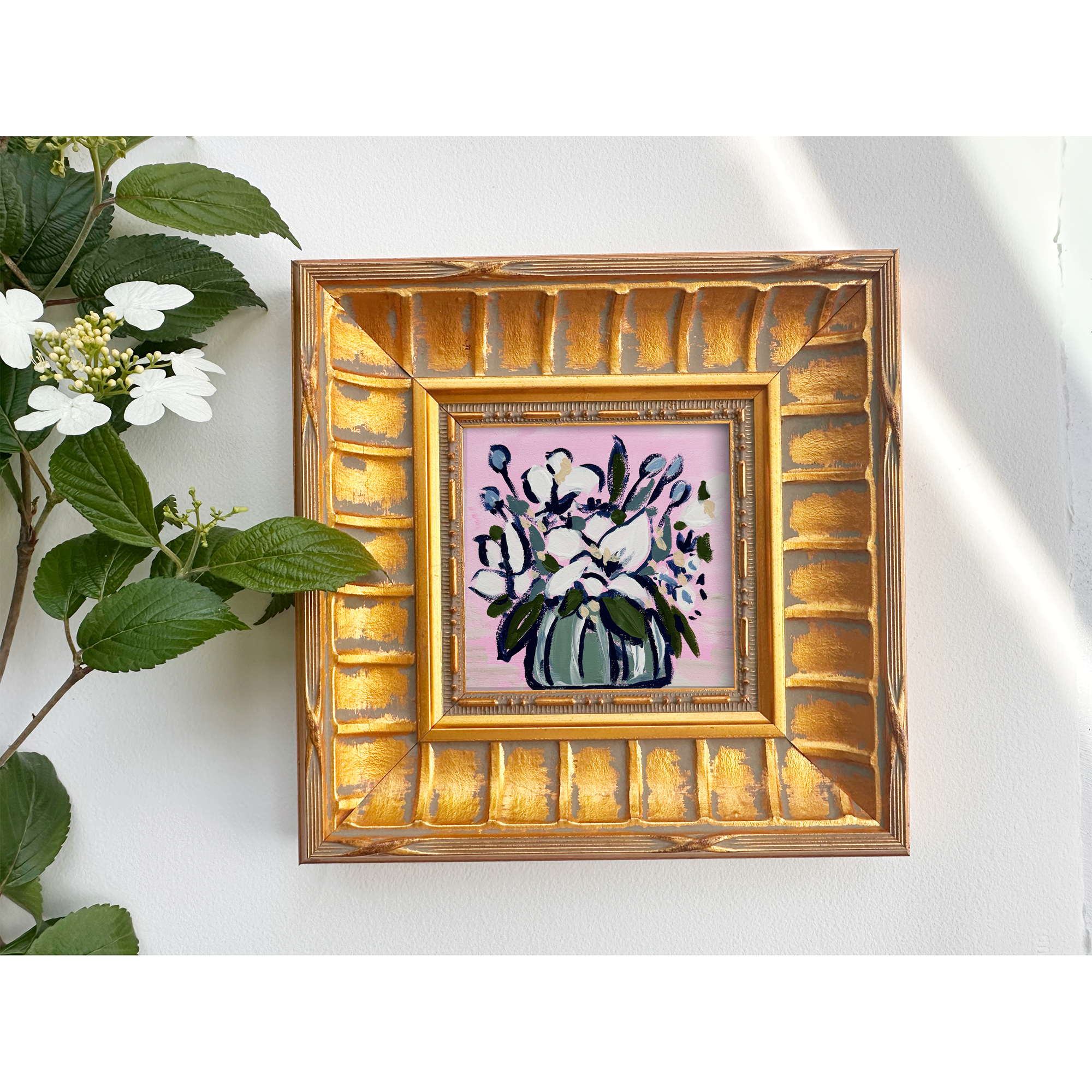 acrylic and gouache paint on canvas board, framed in a gold ornate, traditional style frame
