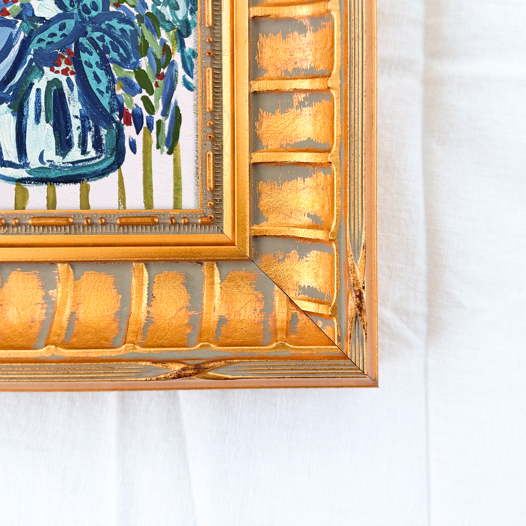 acrylic and gouache paint on gesso board, framed in a gold ornate, traditional style frame