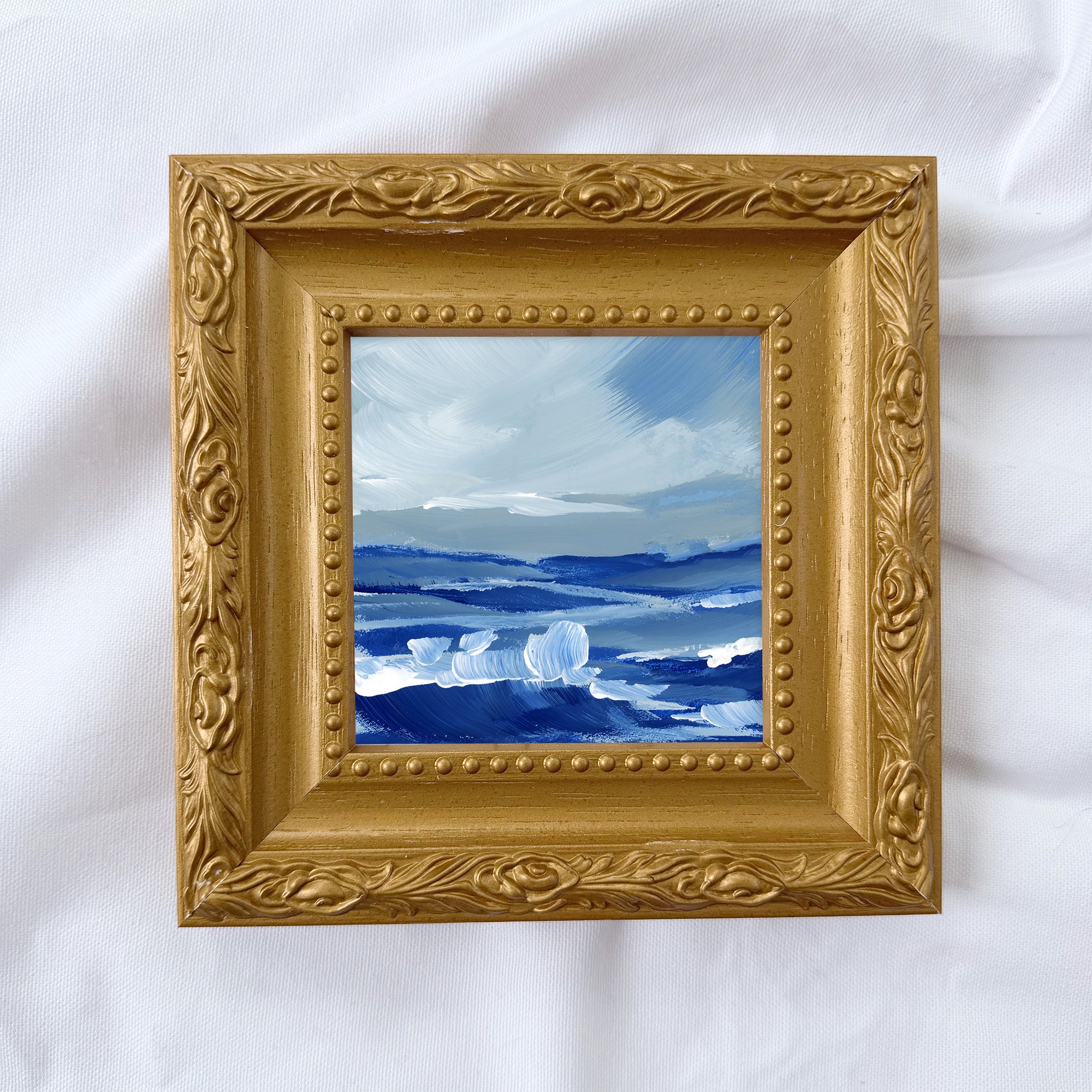 With deep blue waves and foaming white crests, this painting captures the rolling swells of the ocean and their visual similarity to the hills of a distant valley.