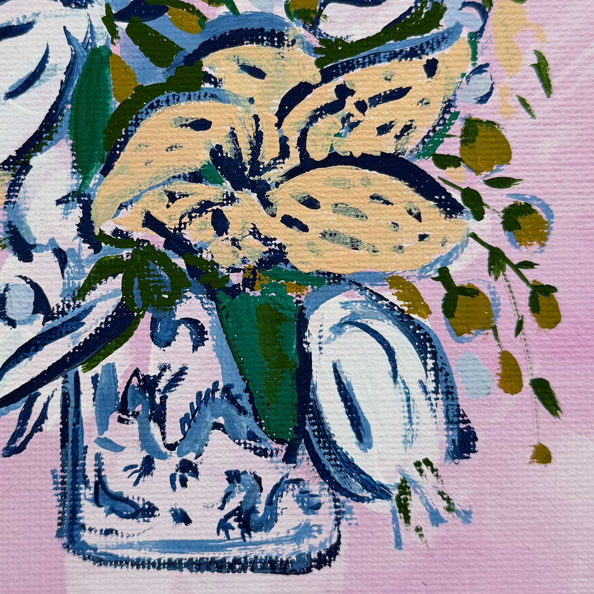 acrylic and gouache paint on canvas board, framed in a gold ornate, traditional style frame