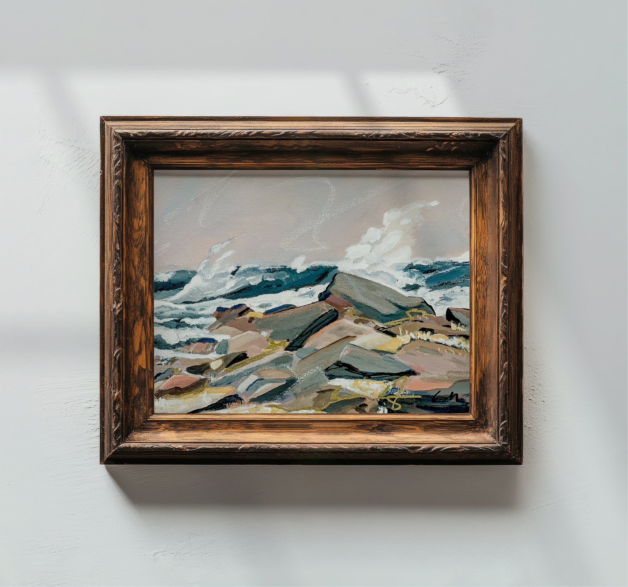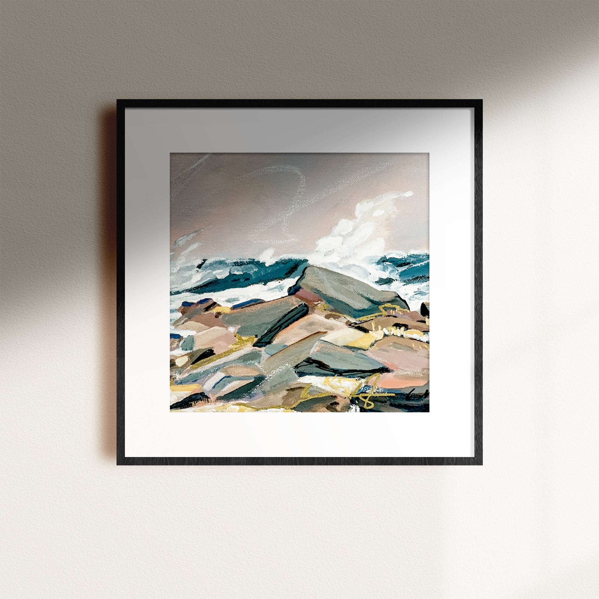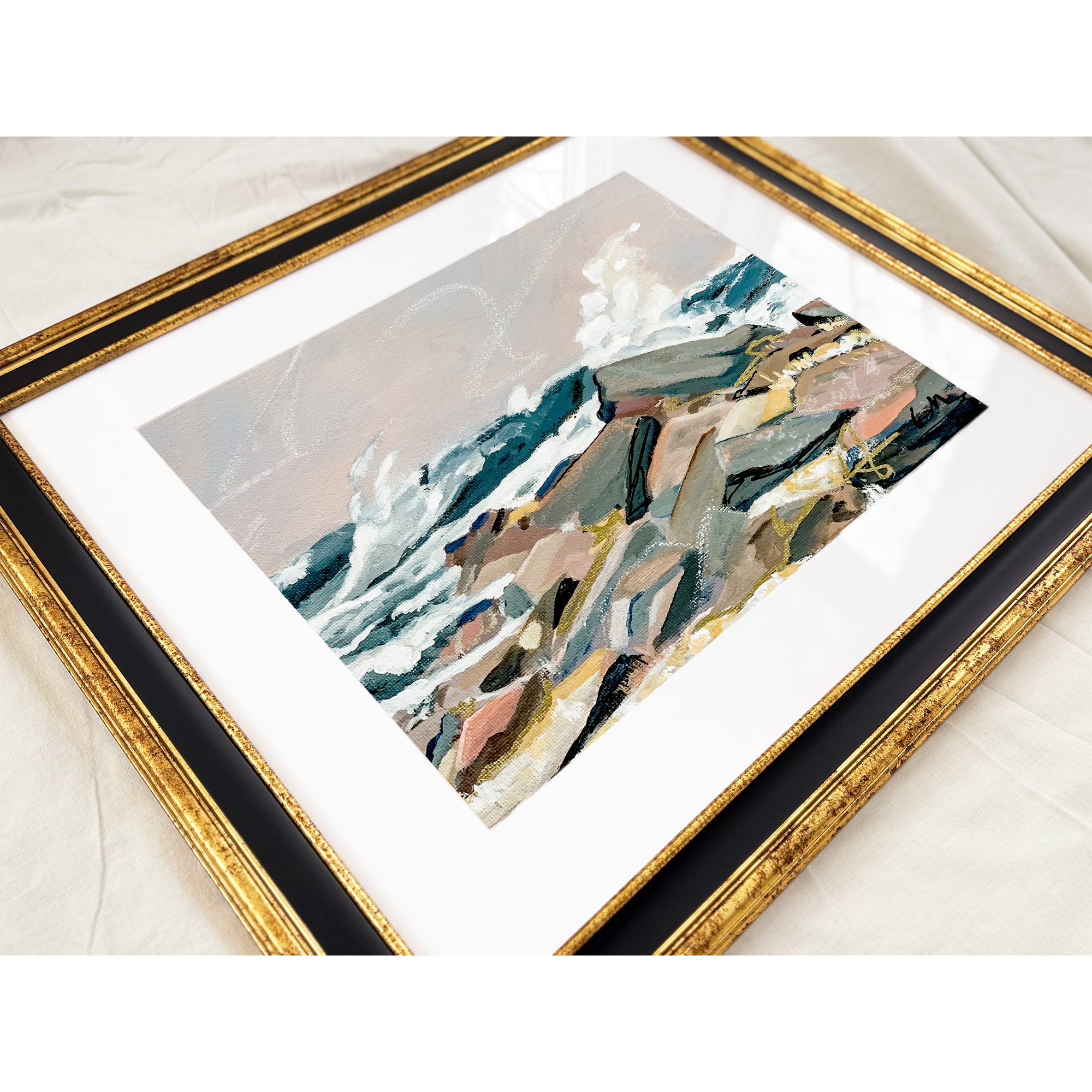 The original painting- from which this print was taken- was inspired by the works of Winslow Homer. This particular image was created after a painting of Prout's Neck, where the artist lived for many pivotal years of his career. In this suite I drew inspiration from several of Homer's coastal paintings and added my personal painting style and color influences for a modern study of the American Master.